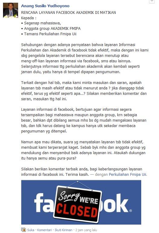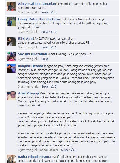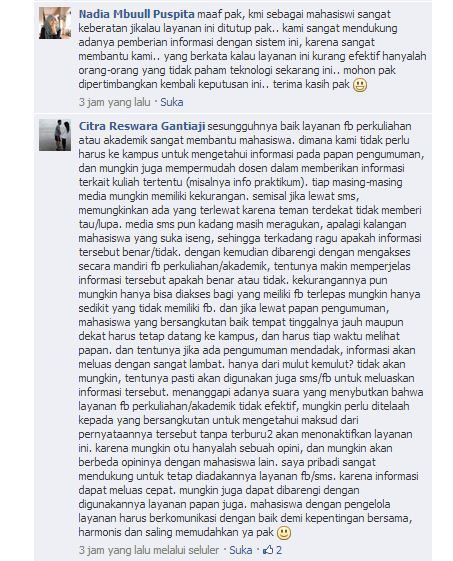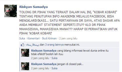 cermati, tulisan yang dimuat KobarKobari pekan lalu tidak berfokus tentang pemberitahuan melalui facebook. Melainkan masalah dosen yang sering